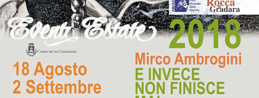 A Gradara, presso Palazzo Rubini Vesin, dal 18 agosto al 2 settembre 2018 sarà aperta al pubblico la mostra d’arte contemporanea “E invece non finisce mai” di Mirco Ambrogini a cura di Michele Fuoco. Ambrogini, stimato artista locale di indiscusso talento e rara sensibilità, espone per la prima volta una selezione di opere che ha realizzato ispirandosi alla produzione discografica del celebre cantante Roberto Vecchioni al quale è legato anche da un rapporto di amicizia e di reciproca stima Sin dal titolo “E invece non finisce mai” – verso tratto da uno dei brani più amati dal pubblico – si evince il legame fra i dipinti in mostra e le canzoni che li hanno ispirati.